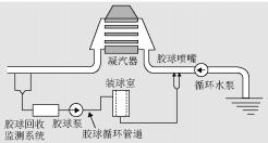 在發(fā)電過程中,凝汽器管壁會(huì)出現(xiàn)不同程度的污垢影響凝汽器換熱,造成機(jī)組真空降低,增加發(fā)電煤耗。目前,大多數(shù)電廠對(duì)凝汽器的結(jié)垢主要是采用周期性高壓清洗的辦法進(jìn)行處理,即膠球清洗裝置。凝汽器膠球清洗裝置是由收球網(wǎng)、膠球輸送泵、裝球室、控制器、膠球及閥門管路等部件組成的,如圖1所示。它借助高壓水流的作用將大于凝汽器冷卻管內(nèi)徑的清潔膠球擠過冷卻管,對(duì)冷卻管進(jìn)行反復(fù)擦洗,清洗凝汽器冷卻管內(nèi)污垢并帶出雜質(zhì)。從而可以實(shí)現(xiàn)延長(zhǎng)冷卻管使用壽命、提高發(fā)電廠經(jīng)濟(jì)效益、保障機(jī)組安全運(yùn)行的目的。而膠球清洗裝置系統(tǒng)清潔效果能否達(dá)到佳,依賴于膠球個(gè)數(shù)是否足量、膠球半徑是否夠大?偸谴嬖谶@樣或那樣的原因?qū)е虑逑催^程中膠球的堵塞,出現(xiàn)丟球現(xiàn)象,或者造成膠球磨損,這都直接影響了換熱效果。