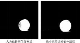 本文根據(jù)膠球圖像的特點(diǎn),采用了小誤差分割算法進(jìn)行梯度圖像分割。用小誤差法求取佳閾值的計(jì)算公式如下:J(t)=1+2×[p0(t)lnσ0(t)+p1(t)lnσ1(t)]-2×[p0(t)lnp0(t)+p1(t)lnp1(t)]上式為計(jì)算圖像佳分割閾值的判斷準(zhǔn)則函數(shù),它表示了小錯(cuò)誤分割概率的問題。其中:p0(t)=ih(i),p1(t)=ih(i)為兩類的樣本總數(shù);μ0(t)=i·i,μ1(t)=為兩類樣本的分布均值。其中,min為圖像中小灰度值,max為大灰度值。通過循環(huán)計(jì)算每個(gè)t值對(duì)應(yīng)的J(t),從中找出J(t)小值對(duì)應(yīng)的t,即為分割的佳閾值。t3=ArgminJ(t)(對(duì)于256級(jí)灰度圖,l=255)i∈{0,1,…,l}由圖6兩種處理結(jié)果可知:采用小誤差分割算法獲得的二值化圖像效果更好。