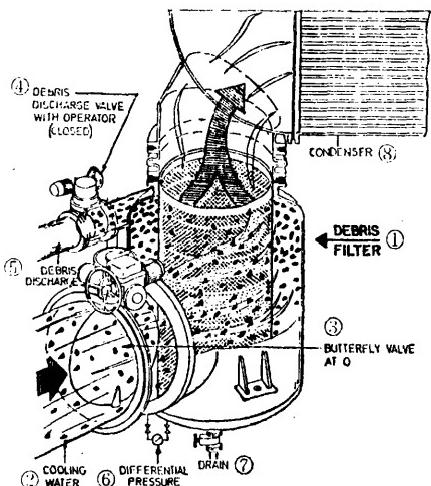 ①一過(guò)網(wǎng);②—冷卻水進(jìn)口:③—蝶悶(在0°位置);④一放垃圾閥及操作器(在關(guān)閉狀態(tài));⑤一放垃圾管;⑥一差壓計(jì);⑦一放水門(mén);⑧—凝汽器。