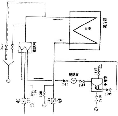 昆廠1、2機(jī)為N100-90/535型,額定功率100MW,配置68151型對分雙流程,表面式凝汽器。膠球清洗裝置由以下主要部件組成:膠球泵、裝球室、收球網(wǎng)及用閥門、管路、見圖1。