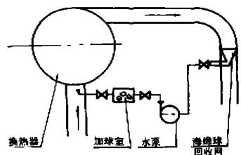 海綿膠球自動清洗系統(tǒng)如圖2所示。清洗系統(tǒng)有設的水泵,使水形成一個單獨的循環(huán)回路,海綿膠球被這股水流帶動,通過換熱器和回收網(wǎng)等作循環(huán)運行。在此系統(tǒng)中的回收網(wǎng)約增加阻力0.006~0.008MPa,如無用水泵可以選用適當?shù)奈鬯脕泶妗G逑创螖?shù)可以根據(jù)換熱器的運行工況來定,也可以通過實際應用找出佳的清洗次數(shù)。