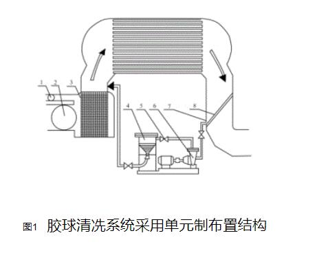 圖中:膠球清洗系統(tǒng):1、收球網(wǎng);2、壓差測(cè)量裝置;3、閘閥;4、三通器;5、膠球泵;6、電動(dòng)球閥;7、裝球室;8、放水門;9、放氣門;10、膠球管路;