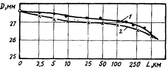 測量表明,試驗用球在水里的膨脹度為10%~15%。而且在膠球漫入水中的前5~8小時內(nèi)體積漲大的快,其后逐漸減慢,經(jīng)過400~500小時之后,實際上已不再變化。所有研究用的膠球被水浸透之后的浮力都是負值,在水中下沉的速度為15~40米/秒,僅從有利于膠球在水空間內(nèi)均勻分布的角度,這種膠球是完全可以采用的。對膠球磨損所作的研究表明,當膠球沿著進口加工成良好的鐘罩形(即園角過度一譯注)的新凝汽器管子流動時看不到膠球表面有磨損的情況。當管子內(nèi)壁臟污且呈中等程度的粗糙狀態(tài)時,膠球在流動的初始階段磨損強烈,而后逐漸減緩(見圖1)。一些試驗還表明,橡膠海綿球在開始投用和沿管道流動500~750公里(也即經(jīng)歷70~100小時的運行,其直徑已磨損到等于管子的內(nèi)徑)之后具有良好的球形。在中間階段呈園柱形。