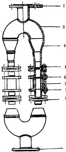 ①球分離器通常,回收的球在經(jīng)過(guò)配管時(shí),呈互相重疊流過(guò),此時(shí)若用光電開(kāi)關(guān)檢出時(shí),數(shù)目不準(zhǔn)確。球分離器做成如2圖的形狀,它能夠分離球和用光電開(kāi)關(guān)檢出通過(guò)的球數(shù),此分離器用法蘭裝在配管系統(tǒng)中。分離器的原理如下:流過(guò)配管的球,經(jīng)180°彎頭分成兩路,分別通過(guò)兩段漸縮管流入透明管段,此時(shí)即由配置在透明管段處的光電開(kāi)關(guān)將通過(guò)的球數(shù)記錄下來(lái)。