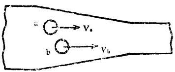 這個(gè)分離器的兩段漸縮管能夠?qū)⒁黄鹆鬟^(guò)的球分成單個(gè)的,防止成群通過(guò)透明管段。其原理為;通常,流速V和流量Q、斷面積A的關(guān)系為0如3圖所示,漸縮管入口管徑為D,出口管徑為D/X,入口側(cè)流速為V?,出口側(cè)流速為V?,此時(shí)入口側(cè)和出口側(cè)的流速關(guān)系為:(1)入口側(cè)斷面積.(2)出口側(cè)斷面積.(3)由(2)(3)及(1)式∴V?=X2V?(4)即當(dāng)出口側(cè)管徑為D/X時(shí),流速成X2倍數(shù)增加。所以如4圖所示當(dāng)a、b兩個(gè)球從漸縮管流入時(shí),由于上述原理形成Va<Vb,流速的變化產(chǎn)生了分離效果,a、b兩球通過(guò)透明管段時(shí),形成完全分離的狀態(tài),因而能夠防止錯(cuò)誤計(jì)數(shù)。漸縮管漸縮部分的斷面收縮比和它的長(zhǎng)度,由實(shí)際使用的系統(tǒng)流速和單位時(shí)間內(nèi)通過(guò)的球數(shù)決定。