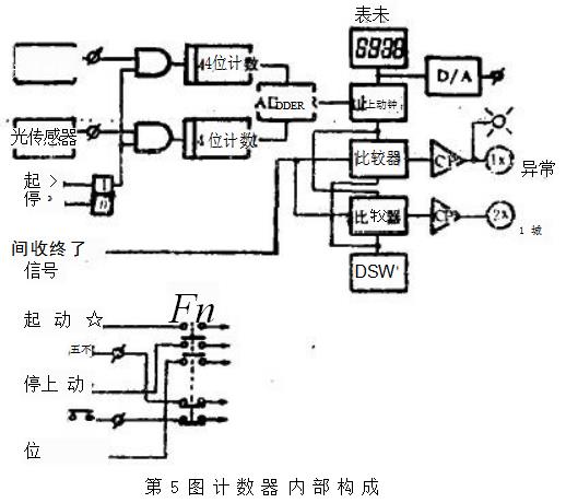 5圖表示了計(jì)數(shù)的構(gòu)成,它具有下列機(jī)能:(a)積算由光電開(kāi)關(guān)發(fā)出的信號(hào),并用計(jì)數(shù)表示器示出。(b)和給定的數(shù)量進(jìn)行比較并向外部輸出。(c)將球的數(shù)量用數(shù)字及模擬信號(hào)向外部輸出。此外,計(jì)數(shù)器還可以接受外部信號(hào)自動(dòng)起動(dòng)和停止。