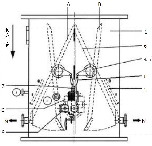 1.殼體2.人孔3.水翼4,5.轉(zhuǎn)動(dòng)軸6.網(wǎng)板7.傳動(dòng)活塞桿8.搖臂9.電動(dòng)頭N.收球管線+/-.壓差測(cè)量系統(tǒng)