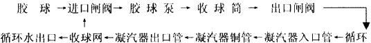 膠球系統(tǒng)主要主要設(shè)備由膠球泵、裝球筒、收球網(wǎng)、膠球泵的進(jìn)出口門以及連接這些設(shè)備的管道組成,其主要系統(tǒng)運(yùn)行流程如圖2所示。