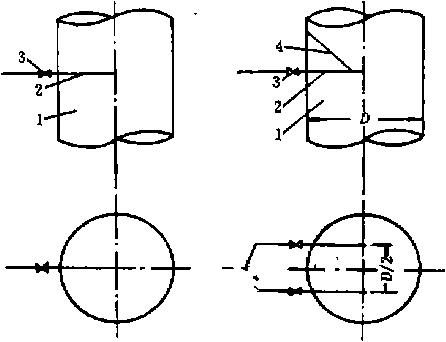 應(yīng)短直、流暢、以盡量減小系統(tǒng)阻力損失.便于膠球進(jìn)入循環(huán)水管并與循環(huán)水均與混合。膠球管宜布置在距凝汽器循環(huán)水進(jìn)口有一定距離的直管段.投球管伸至循環(huán)水管中心,其出口逆循環(huán)水流方向循環(huán)水管公稱通徑dn<1200mm時(shí),投球管用一根,其布置形式見圖(a)1200mm時(shí),投球管用兩根,且應(yīng)對(duì)稱布置,具體要求如圖(b)所示,以便膠球在循環(huán)水中均勻分布。還有一種旋轉(zhuǎn)式投球管,但結(jié)構(gòu)校為復(fù)雜,一旦轉(zhuǎn)動(dòng)部分出現(xiàn)I可題,將會(huì)導(dǎo)致膠球分布不均,嚴(yán)重影響清洗效果,故暫不推薦使用。